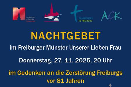 Zum 80. Jahrestag der Zerstörung Freiburgs in der Bombennacht am 27.11.1944 laden der Münsterbauverein, das Evangelische und Katholische Stadtdekanat sowie die ACK (Arbeitsgemeinschaft Christlicher Kirchen und Gemeinden) zum Nachtgebet ins Münster Unserer Lieben Frau am Donnerstag, 27. November um 20 Uhr ein. Die musikalische Gestaltung übernimmt der Männerchor der Freiburger Dommusik.