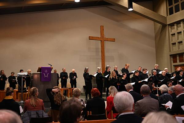 Nicht nur die Bänke der Kreuzkirche waren gut gefüllt. Auch im großen Altarbereich versammelte sich eine Vielzahl von Sänger:innen, Blechbläser:innen und Orchestermusiker:innen. Ergänzt von der Orgel bot das umfangreiche Ensemble unter Leitung von Kantorin Laura Škarnulytė ein großes musikalisches Programm. Es stand aufgrund seiner musikalischen Wucht etwas in Kontrast zur Hauptperson der Feierlichkeiten, Dieter Habel, der als Pfarrer mit der Gitarre bekannt ist.