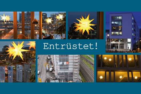 Das Gerüst am Haus der Evangelischen Kirche ist abgebaut. Die Sterne leuchten sichtbar aus den Fenstern. Weihnachten ist das Fest der Entrüstung! Gott hat sich entrüstet, ist sichtbar, nahbar, ungeschützt, eben Mensch geworden!
